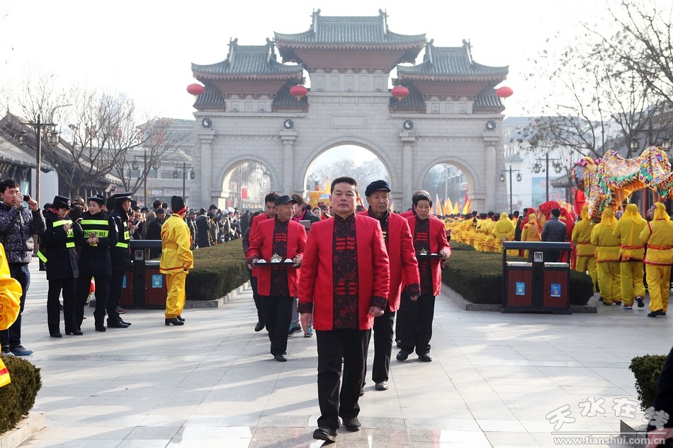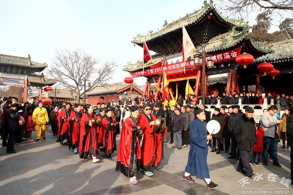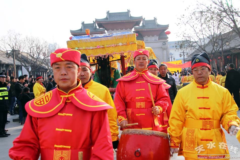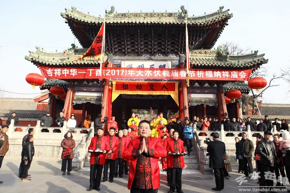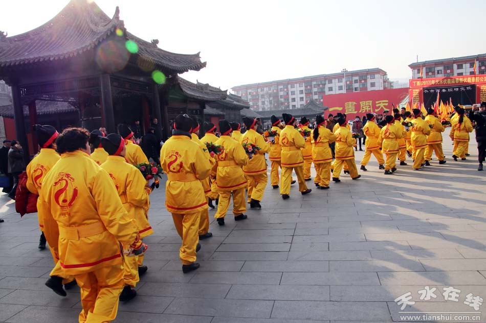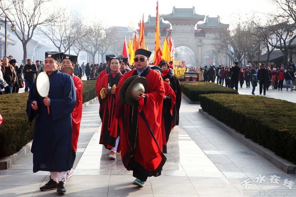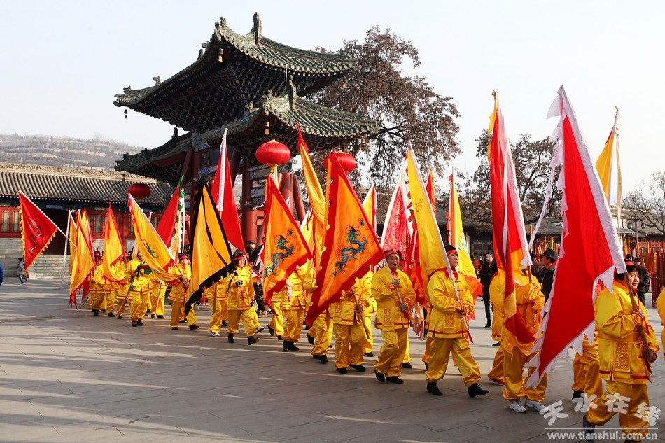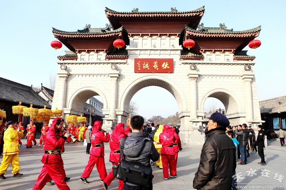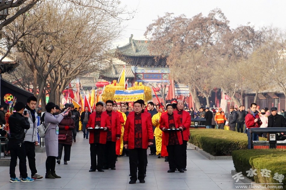 2月9(農(nóng)歷正月十三)日,吉祥中華—丁酉(2017)年天水伏羲廟春祭伏羲活動(dòng)舉行祈福納祥迎圣水儀式。取水供圣儀式結(jié)束后,在伏羲廟大門對(duì)面的戲樓前舉行了出榜文儀式。之后,方神黑爺像在浩浩蕩蕩儀仗隊(duì)伍的“護(hù)駕”下“巡游”伏羲城。