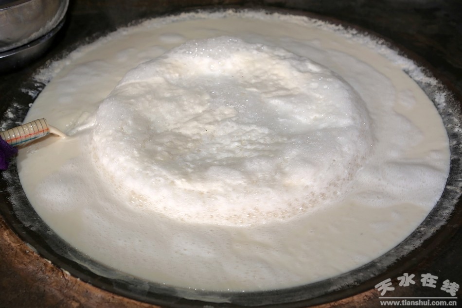 差不多五十分鐘后,兩鍋豆?jié){在灶火的高溫下都煮沸了,裴丙錄將燒開的豆?jié){倒進旁邊的一口大缸里,此時的豆腐坊到處彌漫著濃濃的豆香。一鍋豆?jié){燒好,意味著可以加入漿水讓豆?jié){中的蛋白質凝固了,俗稱“點豆腐”。