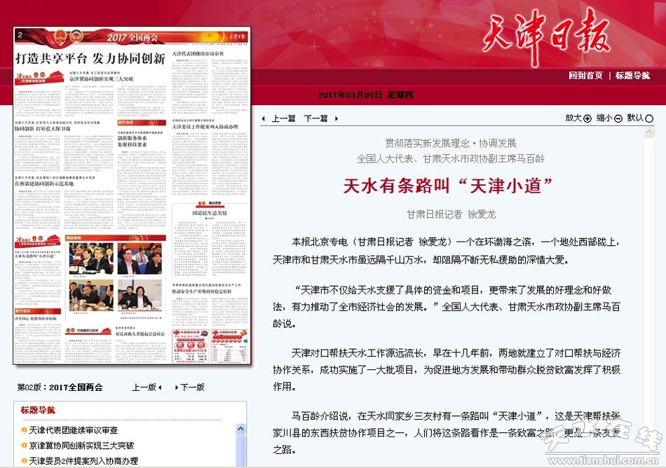 “天津市不僅給天水支援了具體的資金和項(xiàng)目,更帶來(lái)了發(fā)展的好理念和好做法,有力推動(dòng)了全市經(jīng)濟(jì)社會(huì)的發(fā)展!比珖(guó)人大代表、甘肅天水市政協(xié)副主席馬百齡說(shuō)。