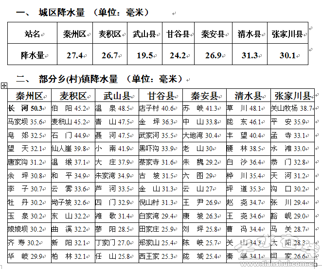 受北方冷空氣影響,2日下午到3日凌晨,我市出現(xiàn)大范圍降水天氣,全市普降大雨,最大降雨量出現(xiàn)在秦州區(qū)長河,達(dá)50.3毫米。此次降雨過程對凈化空氣十分有利,改善了土壤墑情,降低了森林火險(xiǎn)等級,對春耕春播非常有利。