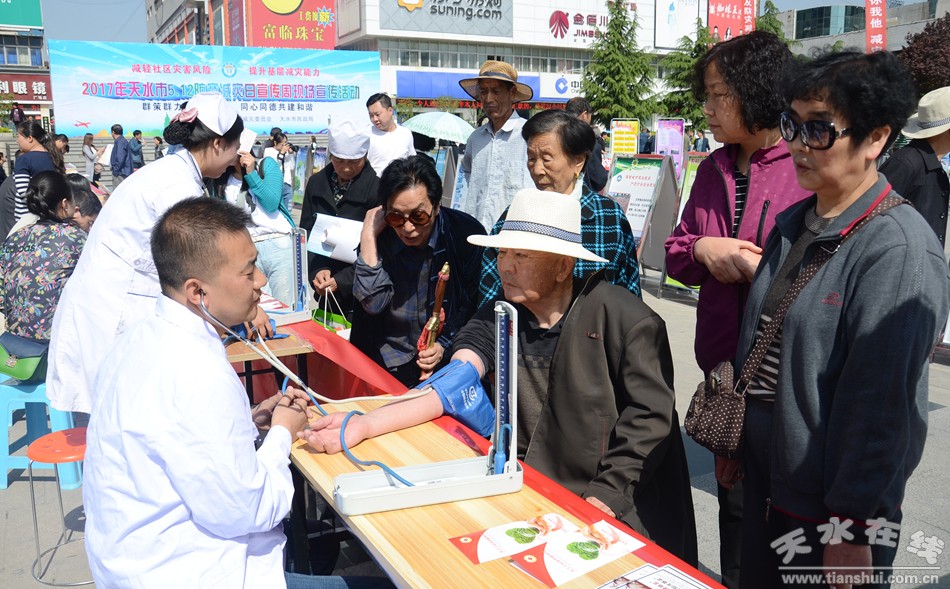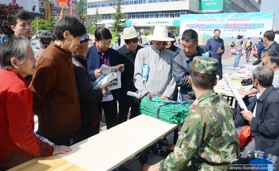 5月8日上午,由天水市減災(zāi)委員會(huì)和天水市民政局共同舉辦的2017年天水市5·12 防災(zāi)減災(zāi)日宣傳周現(xiàn)場宣傳活動(dòng)在龍城廣場舉行。此次活動(dòng)的主題是“減輕社區(qū)災(zāi)害風(fēng)險(xiǎn),提升基層減災(zāi)能力;群策群力防災(zāi)減災(zāi),同心同德共建和諧。”