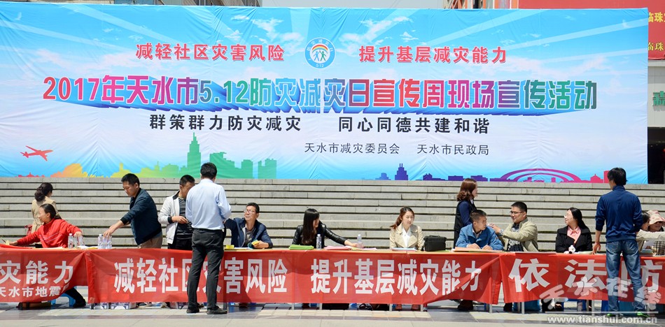 5月8日上午,由天水市減災(zāi)委員會(huì)和天水市民政局共同舉辦的2017年天水市5·12 防災(zāi)減災(zāi)日宣傳周現(xiàn)場宣傳活動(dòng)在龍城廣場舉行。此次活動(dòng)的主題是“減輕社區(qū)災(zāi)害風(fēng)險(xiǎn),提升基層減災(zāi)能力;群策群力防災(zāi)減災(zāi),同心同德共建和諧!