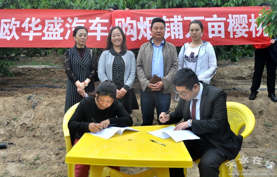 5月的櫻桃樹枝繁葉茂,櫻桃園里一派生機盎然的景象,還未成熟的櫻桃已掛滿枝頭,大大小小錯落有致,看上去顆顆飽滿,形嬌誘人,讓人不由地期盼著它早點成熟。歐華盛汽車俱樂部的會員們走進(jìn)潘芳艷的果園,一邊游覽一邊與她交談,仔細(xì)詢問櫻桃樹的品種、果樹“認(rèn)養(yǎng)”方式、成果采摘等情況。在了解了“認(rèn)養(yǎng)”方法后,歐華盛汽車俱樂部的7位會員親手將“認(rèn)養(yǎng)牌”掛在自己的樹上。隨后,趙玉龍與潘芳艷現(xiàn)場簽訂了《煙鋪櫻桃樹“互聯(lián)網(wǎng)+認(rèn)養(yǎng)+游戲”協(xié)議書》!拔覀兿Mㄟ^此次活動,幫助煙鋪村將農(nóng)業(yè)從單一的生產(chǎn)功能向產(chǎn)品生產(chǎn)、休閑服務(wù)、文化傳承等多功能拓展,解決果農(nóng)自產(chǎn)自銷的一系列難題,帶動他們增收致富,同時借此機會為我們的購車會員帶來福利,豐富大家的休閑生活,實現(xiàn)雙贏。”趙玉龍說。