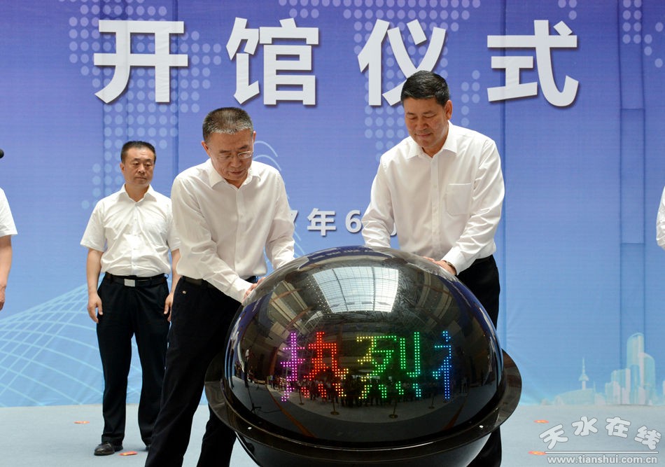 (天水市委書記王銳,市委副書記、代市長王軍共同按下觸摸器啟動(dòng)天水會(huì)展中心開館及展銷活動(dòng))