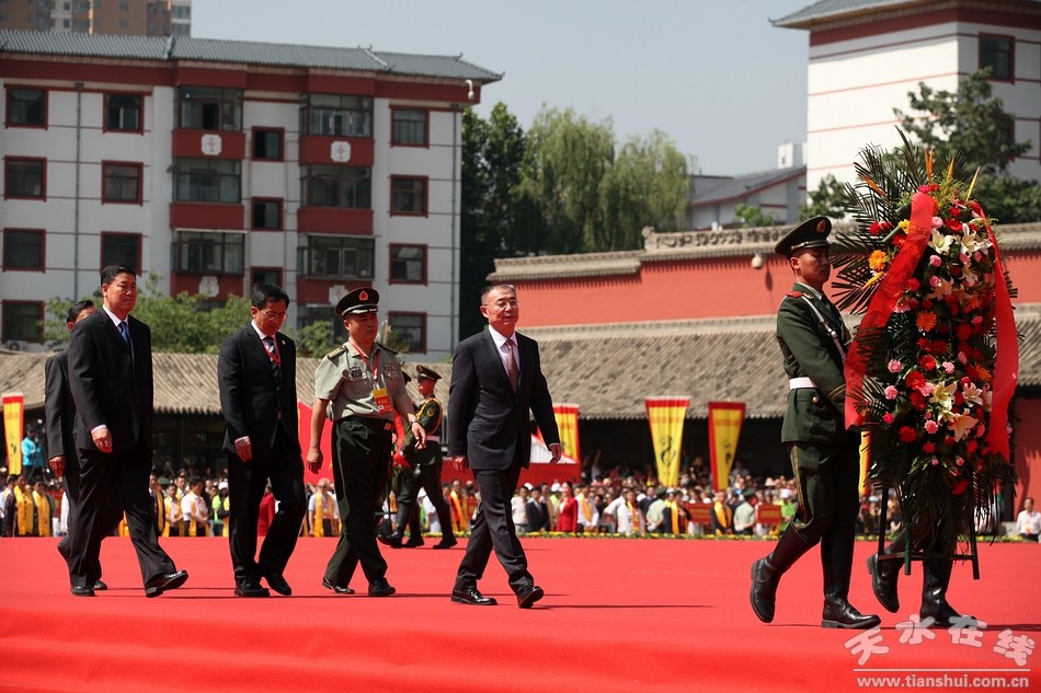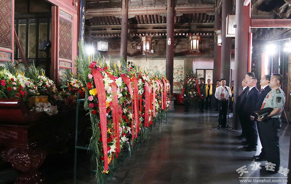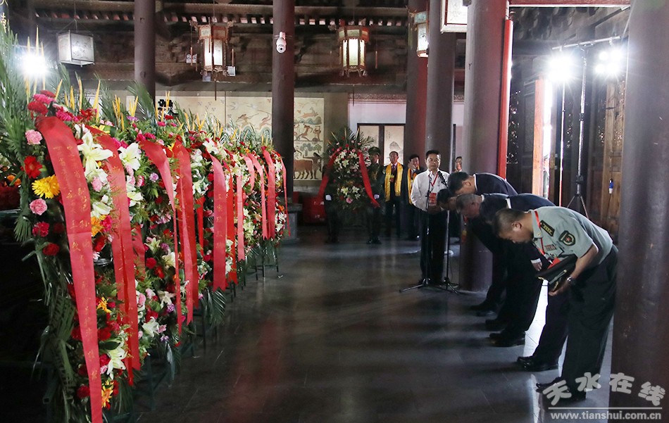 6月22日上午,2017(丁酉)年公祭伏羲大典在伏羲廟舉行。天水市委書(shū)記王銳,市人大常委會(huì)主任王光慶,市委副書(shū)記、代市長(zhǎng)王軍,市政協(xié)副主席王振宇,天水軍分區(qū)政委袁敬偉代表天水380萬(wàn)人民向伏羲圣像敬獻(xiàn)花籃。