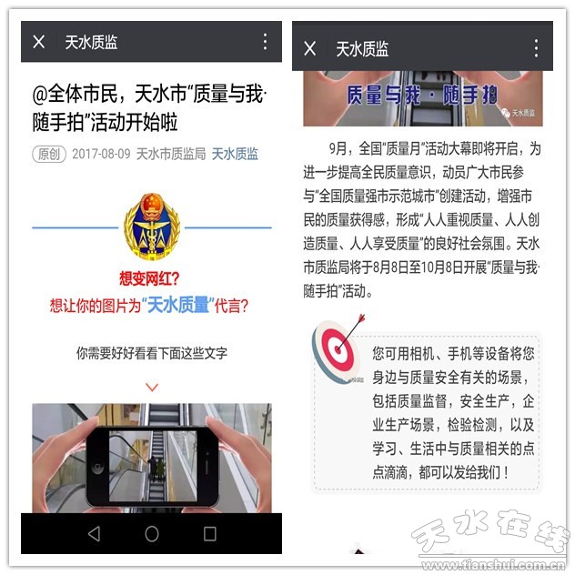 為進(jìn)一步推進(jìn)全國(guó)質(zhì)量強(qiáng)市示范城市創(chuàng)建,引導(dǎo)廣大市民關(guān)心關(guān)注質(zhì)量,積極參與創(chuàng)建各項(xiàng)活動(dòng),近日,天水市質(zhì)監(jiān)局在“天水質(zhì)監(jiān)”微信公眾平臺(tái)開(kāi)展了“質(zhì)量與我·隨手拍”活動(dòng)。
