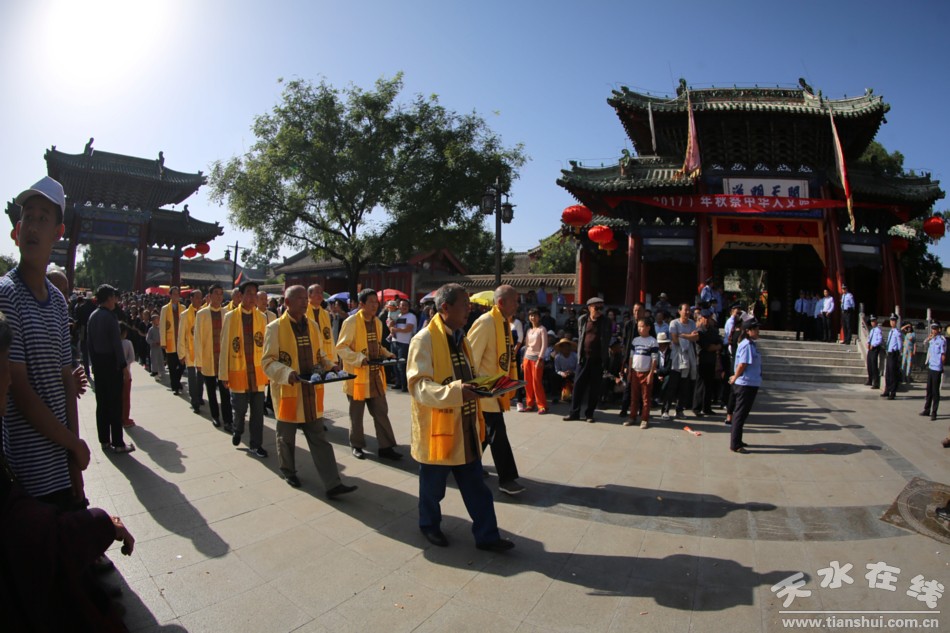 當(dāng)天下午16時許,丁酉(2017)年秋祭伏羲典禮舉行了送神、送圣水、焚燒榜文儀式。儀式依照請方神黑爺至伏羲廟先天殿月臺伏羲圣像前依次展開,由主祭人、助祭人明燭、上香、化表、獻茶、誦經(jīng)、唱頌。隨后,方神黑爺在浩浩蕩蕩依仗隊伍的簇擁下繞伏羲城一周,至伏羲廟西牌坊前舉行送圣水、焚燒榜文儀式,恭送伏羲神位仙升。