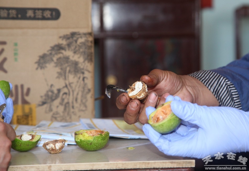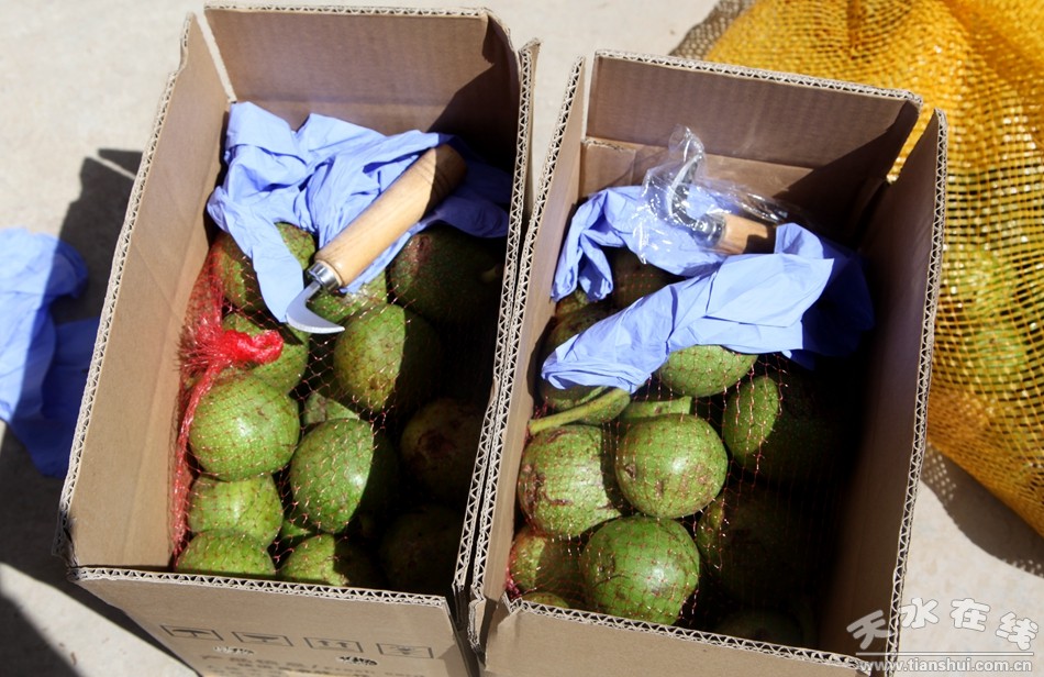 為了讓購買青皮核桃的客戶方便去皮,村民細心地在發(fā)貨箱里面放置了剝皮工具和手套。 |