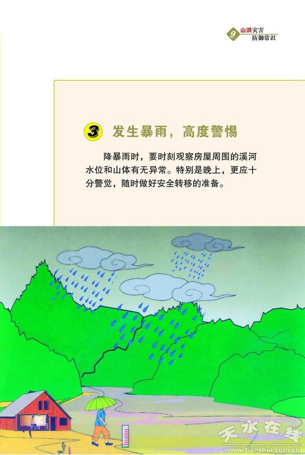 (3)多留心注意山洪可能發(fā)生的前兆,動員家人做好隨時安全轉(zhuǎn)移的思想準備。