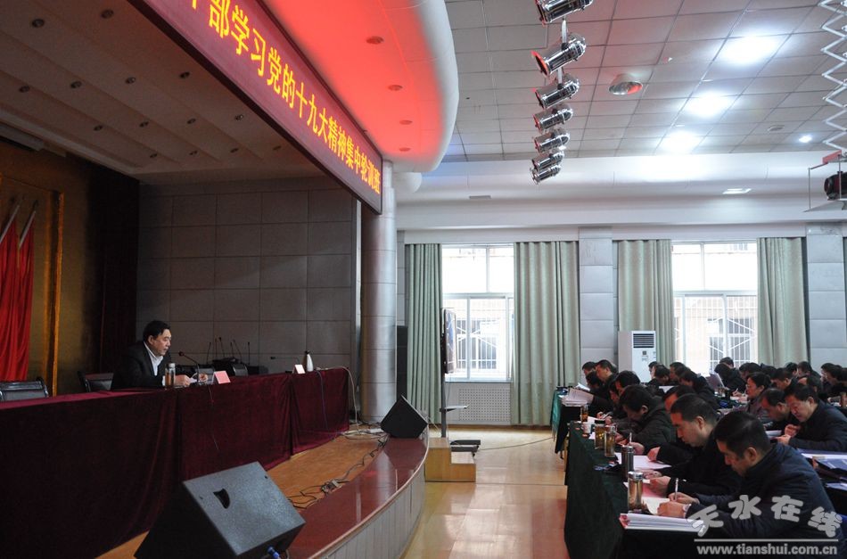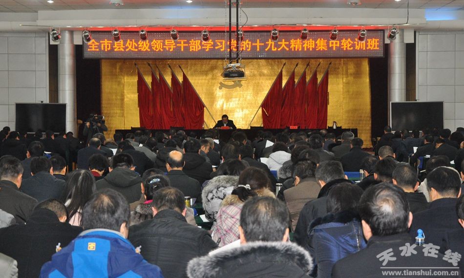 1月25日,天水市委常委、常務(wù)副市長(zhǎng)趙衛(wèi)東為參加全市縣處級(jí)領(lǐng)導(dǎo)干部學(xué)習(xí)黨的十九大精神集中輪訓(xùn)班的學(xué)員作專題輔導(dǎo)報(bào)告。