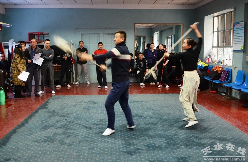 為推動(dòng)秦腔發(fā)展,提高全體人員專業(yè)水平,此次匯報(bào)考核在天水市文化和旅游局副局長(zhǎng)楊春曉組織帶領(lǐng)下,市西秦腔研究院副院長(zhǎng)常小紅、袁丫丫、孟滿印及市文化和旅游局相關(guān)業(yè)務(wù)科室科長(zhǎng)作為評(píng)委參加了此次考核?己瞬扇∪汗_觀摩,評(píng)委打分,綜合考評(píng)的形式進(jìn)行,要求業(yè)務(wù)人員結(jié)合自身行當(dāng)現(xiàn)場(chǎng)演出?己藘(nèi)容包括身段、腿功、毯子功、把子功,唱、念、做、打綜合片段,領(lǐng)奏司鼓、伴奏隨奏。