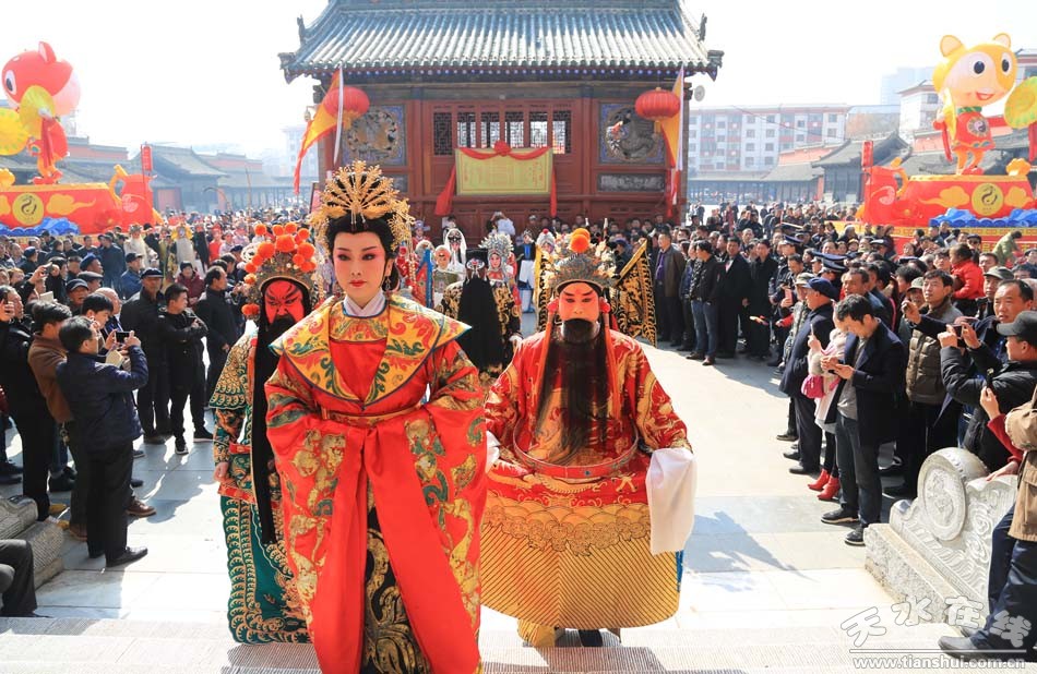 2月28日,農(nóng)歷正月十三,天水市西秦腔研究院(天水市秦劇團)全體人員走進伏羲廟舉行戊戌(2018)年伏羲廟會開戲祭拜伏羲儀式。全體演出人員各自裝扮成秦腔劇目《麥積圣歌》乙弗氏,《龍鳳呈祥》劉備,《穆柯寨》穆桂英,《出五關》關公和張飛,《黃河陣》三霄娘娘 ,《五典坡》王寶釧,《鍘美案》秦香蓮、包公、韓琦、門官、公主等, 《法門寺》趙廉、孫玉姣、宋巧,《游龜山》田夫人、田玉川,《白逼宮》漢獻帝,《趙氏孤兒》趙盾,《游西湖》裴生,《斷橋》白素貞,《哪吒鬧!纺倪,《小宴》呂布,《大升官》徐彥昭等角色,由天水市西秦腔研究院副院長袁丫丫帶領,走進伏羲廟舉行祭拜伏羲儀式。下午二時,由天水市西秦腔研究院(天水市秦劇團)承擔的伏羲廟會大戲鳴鑼開演。