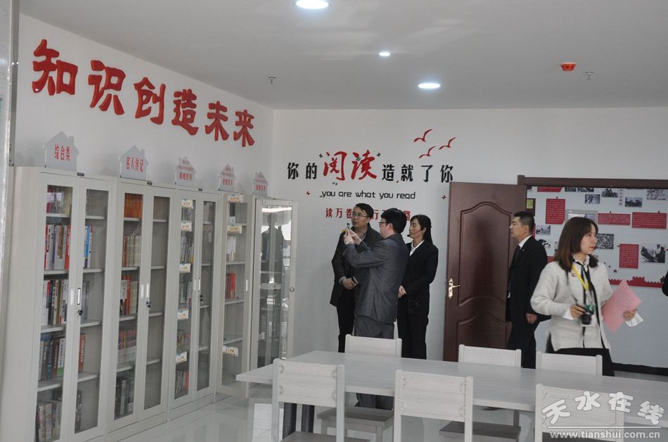 (采訪團參觀和諧路社區(qū)寬敞明亮的社區(qū)圖書館)