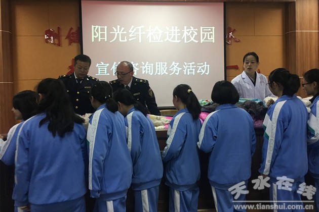 一是天水市纖維檢驗所在天水市第一中學(xué)組織開展了“陽光纖檢進校園”宣傳咨詢活動。本次活動以“關(guān)注消費品質(zhì)量,關(guān)愛你我他安全”為主題。專業(yè)技術(shù)人員結(jié)合日常生活實際,向廣大師生詳細講解纖維質(zhì)量知識,校服、床單、被褥等纖維制品辨別和選購常識,棉花的種類及用途等。工作人員現(xiàn)場對合格與不合格纖維制品進行了對比展示,供師生觀摩學(xué)習(xí)。活動中,發(fā)放《絮用纖維制品鑒別方法》等宣傳資料200余份,解答學(xué)生提出的問題10余條。通過活動,效普及了纖維制品質(zhì)量安全常識,提高了廣大師生的校服質(zhì)量辨別能力和自我保護意識,“陽光纖檢進校園”活動取得實效。