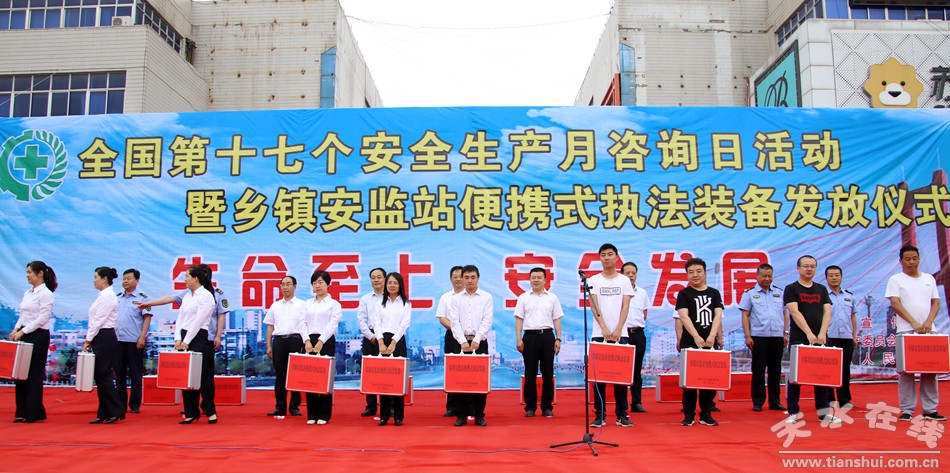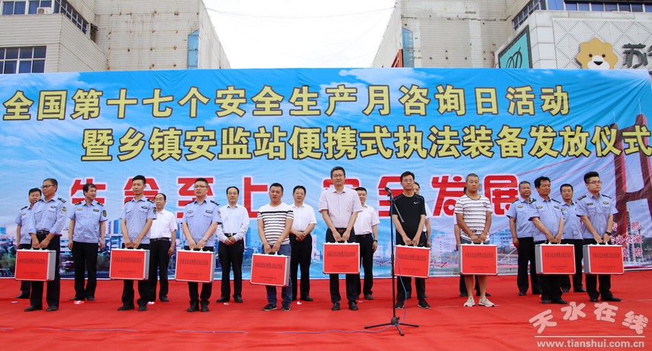 6月16日,天水市在龍城廣場舉行全國第十七個(gè)“安全生產(chǎn)月”咨詢?nèi)栈顒?dòng)暨安全生產(chǎn)執(zhí)法裝備發(fā)放儀式。市領(lǐng)導(dǎo)宋建平、郝文杰、郭明興參加活動(dòng)。