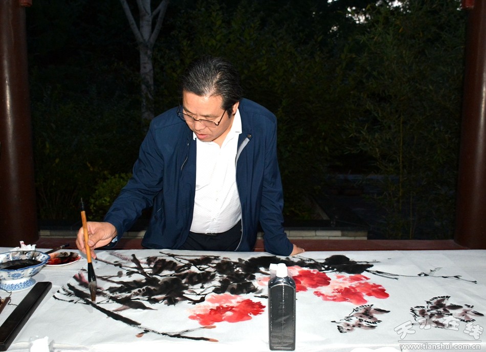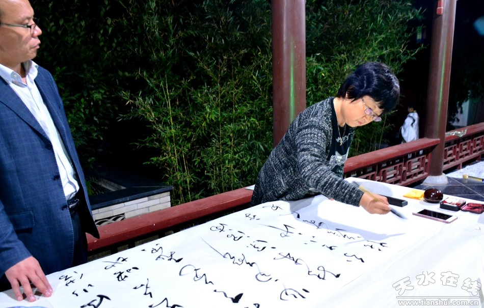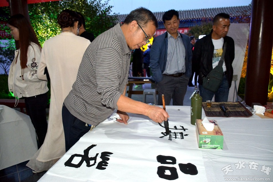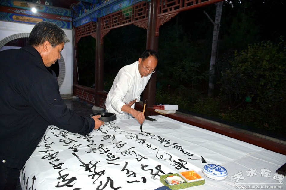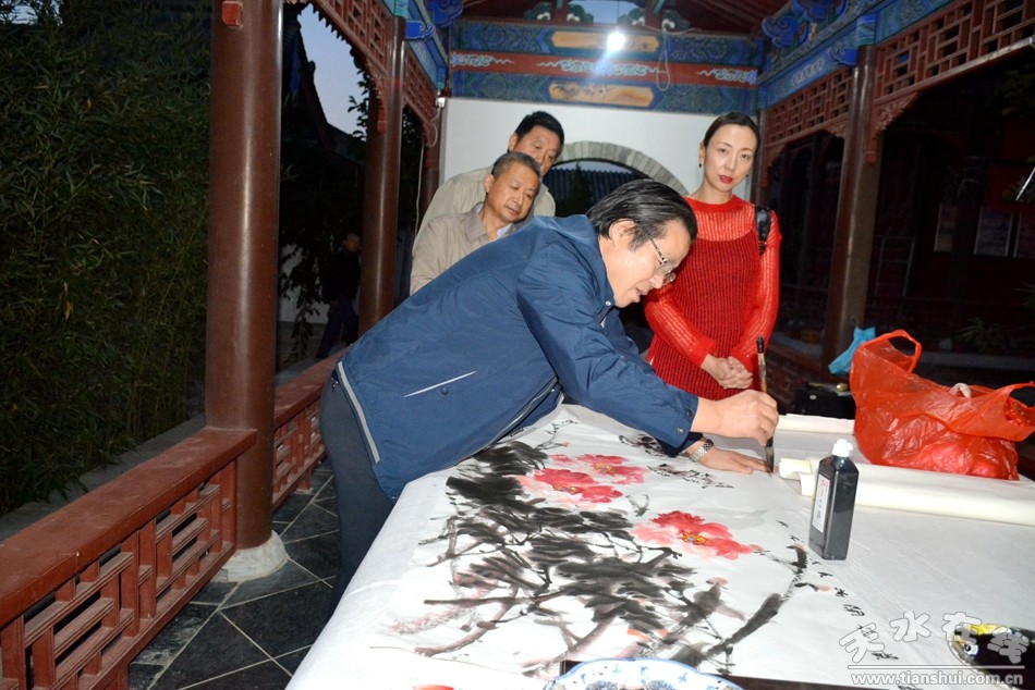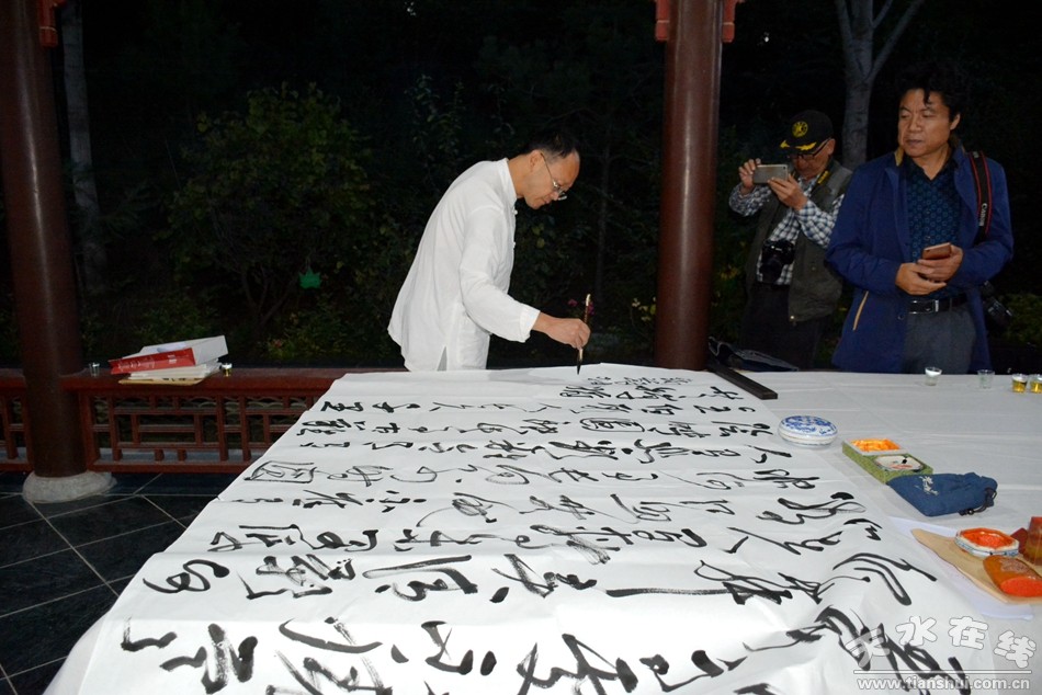 晚7時,活動開始,整個雅集活動包含品茗、聽琴、香道、賞月、詩書繪畫等環(huán)節(jié),天水伏羲琴社琴藝師盛裝表演了《詩經(jīng) 蒹葭》《神人暢》《暗香》等琴藝,天水國馥茗茶業(yè)有限公司的茶藝師們表演了中國傳統(tǒng)茶藝。彭衛(wèi)、王斌、李籠、張芳、董福元等書畫家們揮毫潑墨,現(xiàn)場進行了書畫創(chuàng)作。