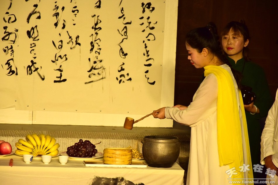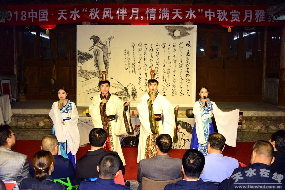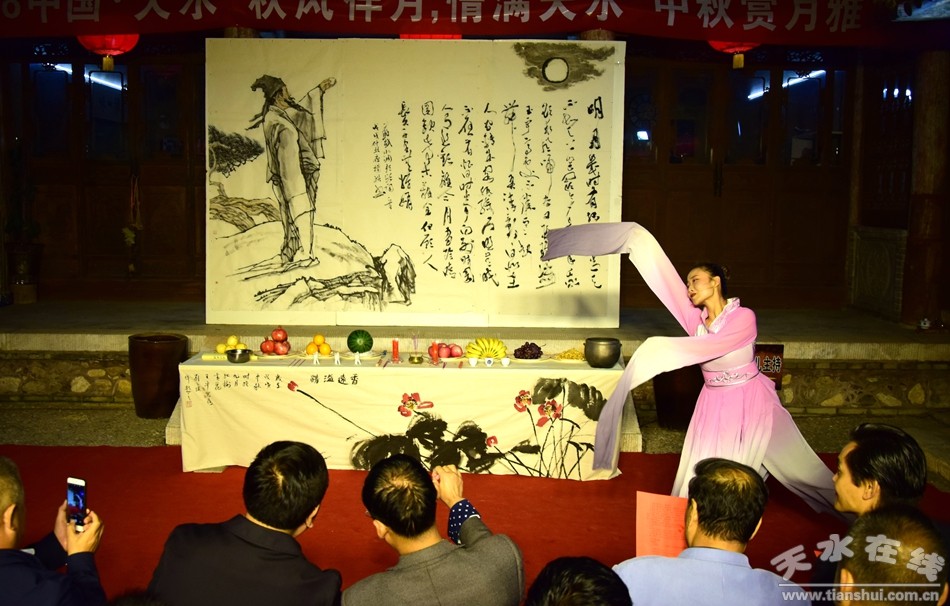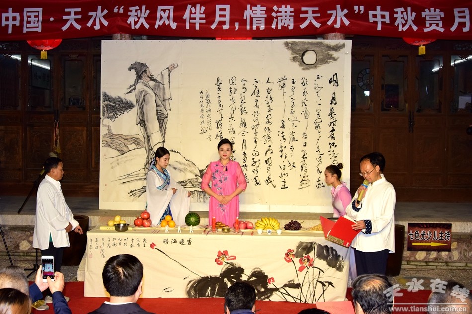 戊戌之秋,仲秋之月,日在牽牛,旦觜觽中。律中南呂,日月同度,鴻雁來賓,節(jié)屆國慶。天水各界代表匯聚66號(hào)院創(chuàng)意館,謹(jǐn)以鮮花素果,時(shí)味珍饈,酒饌雅樂之儀,屬文舉禮,香致祭于月神。