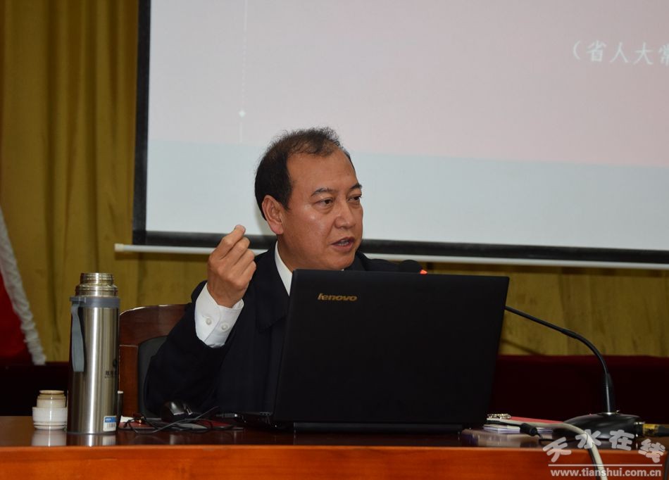 省人大常委會(huì)委員、省人大法制委員會(huì)副主任委員、省人大常委會(huì)法工委主任李高協(xié)作了題為《學(xué)習(xí)貫徹憲法修改精神 全面提高憲法實(shí)施水平》專題輔導(dǎo)。李高協(xié)從什么是憲法,什么是憲法修正案;憲法制度的歷史發(fā)展;憲法修改的基本考慮和原則;憲法修正案的主要內(nèi)容和核心要義;深入宣傳和貫徹實(shí)施憲法等方面進(jìn)行全面概括、解讀和輔導(dǎo)。