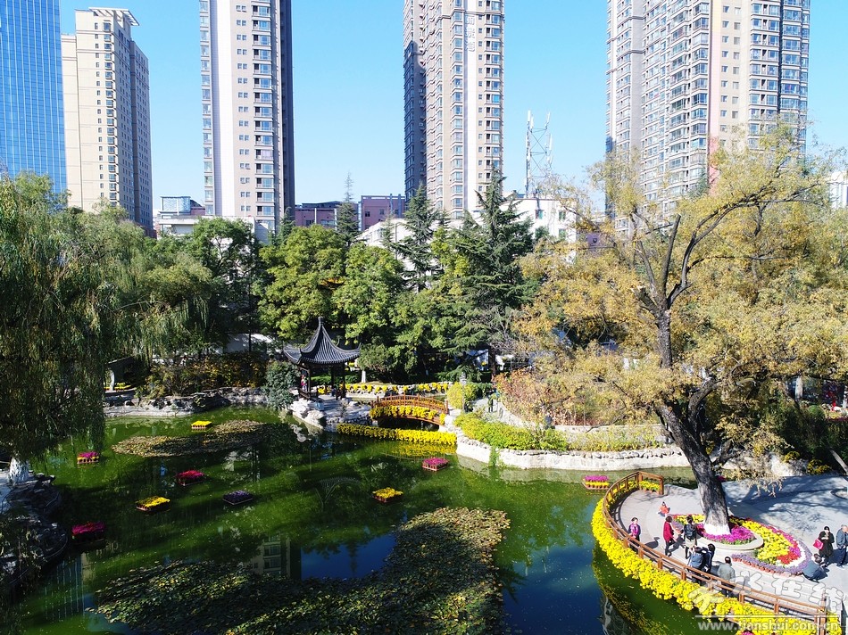 今年的秦州菊展共設八個節(jié)點展區(qū),分別是秦州神韻、臨風潑墨、美好生活、卷帙浩繁、菊田物語、七彩童年、水月藝墟、花倚梧桐。分展區(qū)各設置主題緊扣菊展中心思想,形成輻射帶動效應;主要展示菊花、精品菊、獨頭菊、藝菊、切花菊、干花、菊瓷、剪紙工藝等,整個菊展集觀賞性、知識性、文化性、藝術性于一體;采用展板圖片、景觀小品等多種形式合理巧妙安插,達到以菊為媒,以花傳情的最佳效果。為保證菊花正常開花,園林部門采取了“遮光”等各項栽培技術措施,保證了菊花如期盛開。