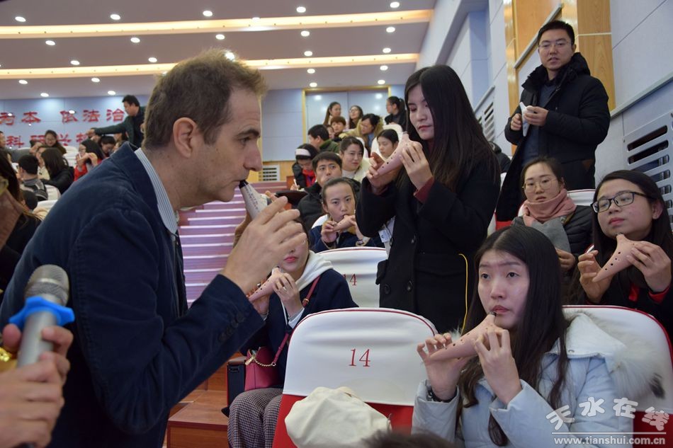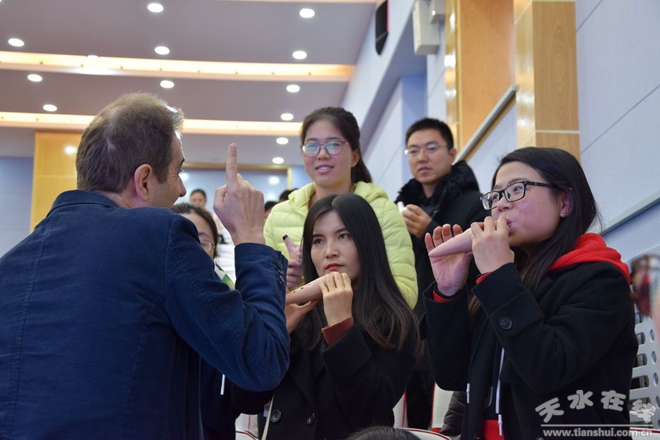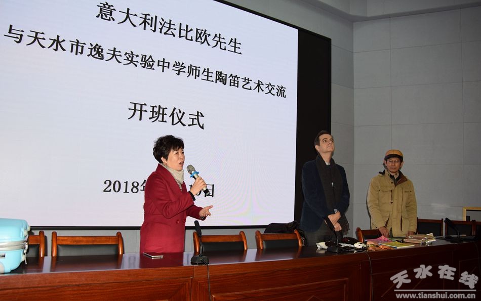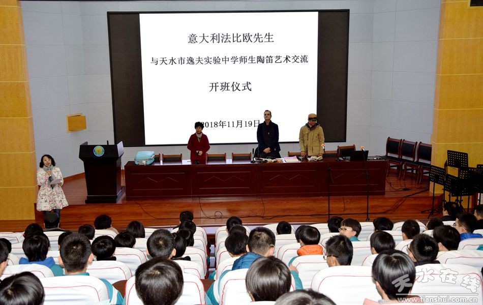 在當(dāng)天舉行的陶笛藝術(shù)交流開班儀式上,天水逸夫中學(xué)校長沈建玲對(duì)法比歐先生一行的到來表示熱烈的歡迎。希望這次藝術(shù)交流能夠進(jìn)一步促進(jìn)天水逸夫中學(xué)藝術(shù)教學(xué)的發(fā)展,進(jìn)一步培養(yǎng)陶笛藝術(shù)人才,培養(yǎng)師生發(fā)現(xiàn)藝術(shù)美、欣賞藝術(shù)、掌握藝術(shù)的能力。