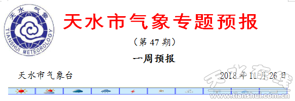 未來一周我市天氣以多云為主,無明顯降水天氣過程;周后期云量增多,最低氣溫略有回升。具體預(yù)報如下:11月26~27日多云,28~30日多云間晴,12月1~2日多云。氣溫預(yù)報以秦州區(qū)為例,日最低氣溫-2~1℃,日最高氣溫11~13℃,日平均氣溫5~7℃。
