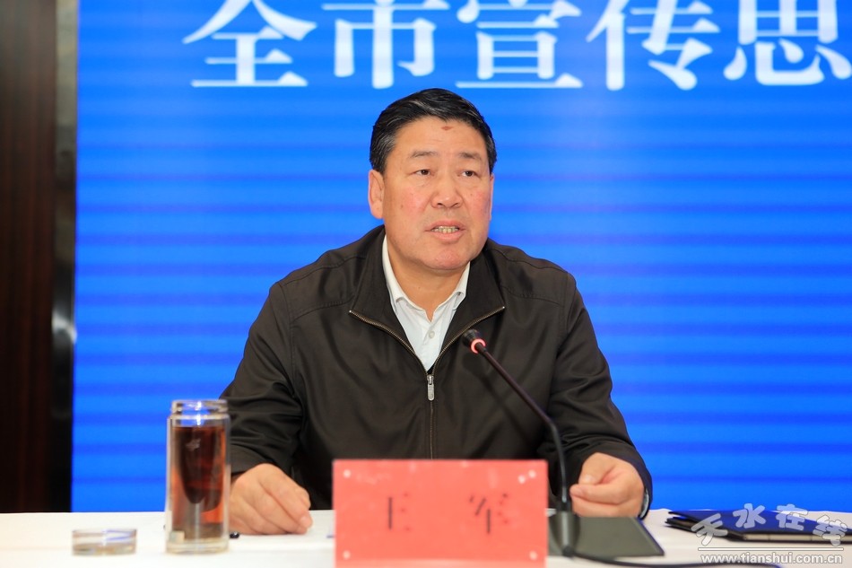 王銳在講話中強(qiáng)調(diào),宣傳思想工作在黨的事業(yè)全局中,有著特殊重要的地位和作用。要始終加強(qiáng)理論武裝高舉旗幟,持續(xù)深入學(xué)習(xí)貫徹習(xí)近平新時(shí)代中國特色社會(huì)主義思想,突出領(lǐng)導(dǎo)帶頭,強(qiáng)化檢查考核,抓好宣講闡釋,在學(xué)懂弄通做實(shí)上下功夫,推動(dòng)這一科學(xué)理論深入人心、落地生根,領(lǐng)航新征程、指導(dǎo)新實(shí)踐、推動(dòng)新發(fā)展。要高度重視意識(shí)形態(tài)凝心聚力,壯大主流思想輿論,堅(jiān)持團(tuán)結(jié)穩(wěn)定鼓勁、正面宣傳為主,統(tǒng)籌開展重大主題宣傳、形勢(shì)政策宣傳、成就典型宣傳;切實(shí)強(qiáng)化風(fēng)險(xiǎn)防控,壓實(shí)壓緊工作責(zé)任制,做到任務(wù)落實(shí)不馬虎、陣地管理不懈怠、責(zé)任追究不含糊。要大力弘揚(yáng)時(shí)代精神育樹新人,以創(chuàng)建全國文明城市為統(tǒng)領(lǐng),筑牢理想信念之基,樹立主流價(jià)值之魂,鞏固尊德守德之本,倡導(dǎo)時(shí)代文明之風(fēng),建設(shè)崇德向善、文化厚重、和諧宜居的文明城市。要深度挖掘豐厚資源繁榮文化,激發(fā)優(yōu)秀傳統(tǒng)文化活力,完善公共文化服務(wù)體系,著力打造區(qū)域首位產(chǎn)業(yè),加快文化旅游強(qiáng)市建設(shè),以高質(zhì)量的文化供給增強(qiáng)人們的文化獲得感、幸福感。要主動(dòng)講好天水故事,結(jié)合紀(jì)念改革開放40周年、新中國成立70周年等重大活動(dòng),組織開展好對(duì)內(nèi)對(duì)外宣傳工作,充分展示天水文化底蘊(yùn)、優(yōu)美生態(tài)、人文環(huán)境和良好形象。