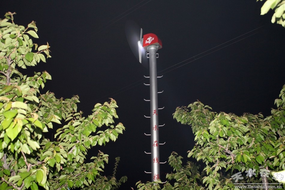 ▲2014年4月25夜,秦州區(qū)玉泉鎮(zhèn)煙鋪大櫻桃基地,由天水在線捐贈(zèng)的3臺(tái)防霜風(fēng)機(jī)發(fā)揮作用。