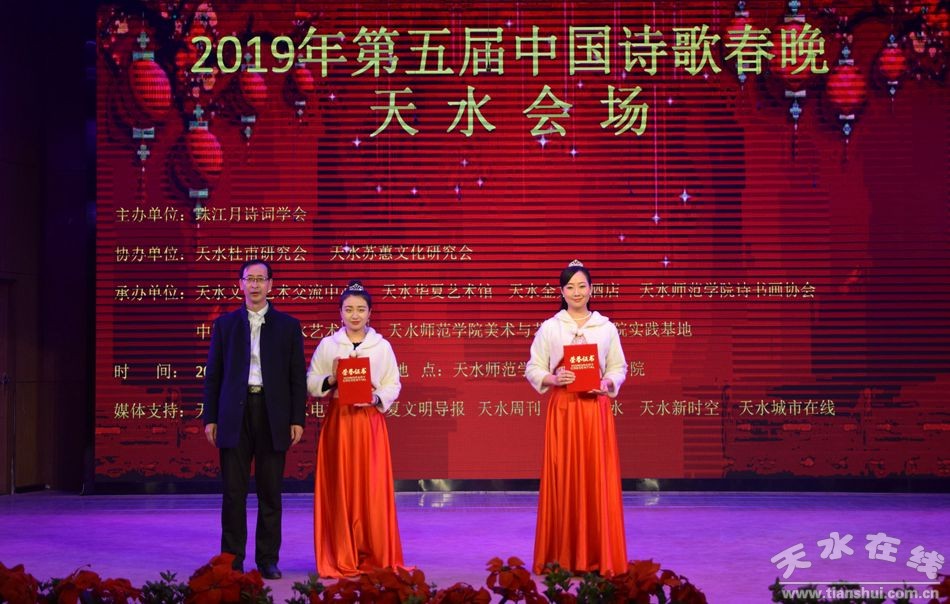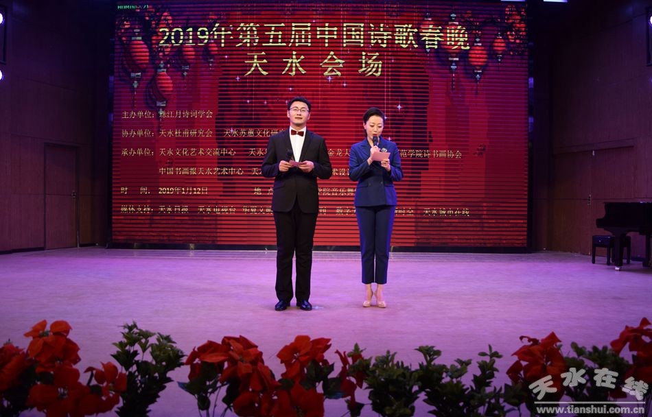 1月12日下午,由珠江月詩(shī)詞學(xué)會(huì)主辦,天水杜甫研究會(huì)、天水蘇蕙文化研究會(huì)協(xié)辦的2019年第五屆中國(guó)詩(shī)歌春晚天水會(huì)場(chǎng)節(jié)目演出在天水師范學(xué)院音樂(lè)廳舉行,F(xiàn)場(chǎng)共表演了詩(shī)朗誦《陋室銘》、《中華少年 》、《讀中國(guó)》,二胡獨(dú)奏《太極琴俠》、陳式太極扇等16個(gè)精彩節(jié)目,近百名詩(shī)詞愛(ài)好者觀看了演出。