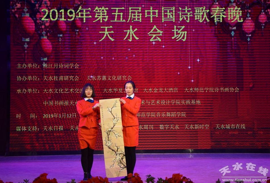 1月12日下午,由珠江月詩詞學(xué)會主辦,天水杜甫研究會、天水蘇蕙文化研究會協(xié)辦的2019年第五屆中國詩歌春晚天水會場節(jié)目演出在天水師范學(xué)院音樂廳舉行,F(xiàn)場共表演了詩朗誦《陋室銘》、《中華少年 》、《讀中國》,二胡獨奏《太極琴俠》、陳式太極扇等16個精彩節(jié)目,近百名詩詞愛好者觀看了演出。