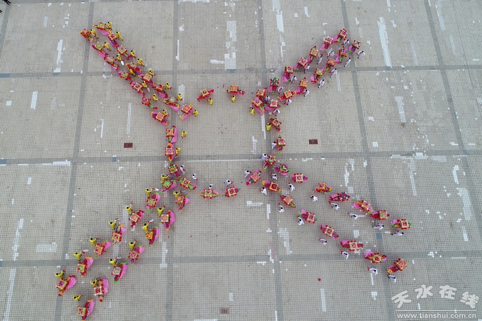 在歡快的鼓聲中,龍騰盛世表演在整齊的鼓聲中奔騰而出,舞龍表演共分為祥龍出宮、飛龍起舞、金龍團(tuán)圓等幾個片斷。伴隨著新春喜慶的鑼鼓,縣直六大口40多個單位700多位干部職工揮舞著70條巨龍,時而上下穿梭、時下騰空而起,時而你追我趕,如同大海搏浪,如同騰云駕霧,如同蛟龍出海,集中展示了清水兒女意氣風(fēng)發(fā)、乘勢而上的時代精神。70條彩龍?jiān)⒁鉃樾轮袊闪?0周年獻(xiàn)禮,其中56條大龍象征56個民族,14條小龍象征著祖國的輝煌與發(fā)展,寓意在新的一年里民族團(tuán)結(jié),和和美美,欣欣向榮。