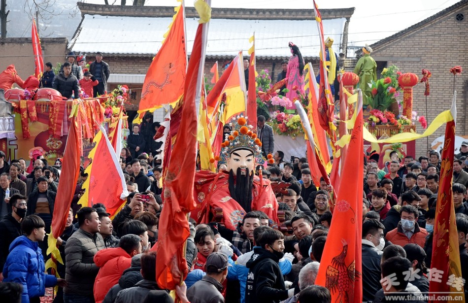 2月18日,農(nóng)歷正月十四。四面八方的人,有開(kāi)車來(lái)的遠(yuǎn)客,有步行來(lái)的村民,有提小板凳的老人,有騎在父親肩頭的孩童,昨夜的一場(chǎng)大雪根本阻止不了人們前往秦安縣蓮花鎮(zhèn)馮溝村“迎神”的步伐。