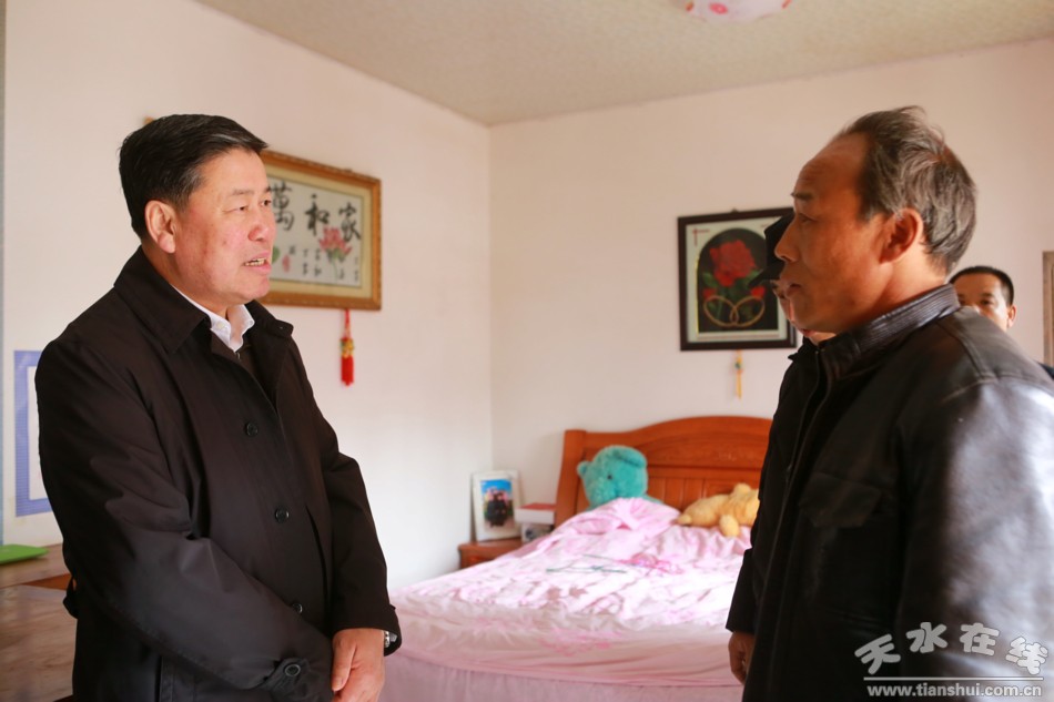 秦州區(qū)娘娘壩鎮(zhèn)白音村,大門鎮(zhèn)王溝村、陰灣村和汪川鎮(zhèn)銀河村都是深度貧困村,地理位置偏遠,貧困發(fā)生率高,脫貧攻堅任務(wù)重、難度大。當(dāng)天,王軍一行隨機入戶到黃世禮、王保田、李貴平、趙小娟等17戶貧困戶家中,認(rèn)真了解住房、吃水、取暖、上學(xué)就醫(yī)、產(chǎn)業(yè)發(fā)展等情況,檢查扶貧政策到村到戶落實得怎么樣。王軍強調(diào),要立足貧困村貧困戶實際,完善落實“一戶一策”各項舉措,因地制宜加快發(fā)展特色產(chǎn)業(yè),大力開展農(nóng)村人居環(huán)境整治,不斷提高脫貧攻堅工作的質(zhì)量和水平,以敢死拼命的精神向貧困發(fā)起總攻,堅決打贏打好精準(zhǔn)脫貧攻堅戰(zhàn)。