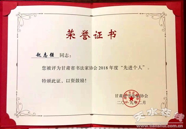 天水市書法家趙志強和張升被評為甘肅省書法家協(xié)會2018年年度“先進(jìn)個人”。