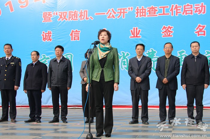 市委常委、統(tǒng)戰(zhàn)部部長溫利平宣布天水市部門聯(lián)合“雙隨機、一公開”抽查活動啟動;市人大常委會副主任宋建平,副市長王燕,市政協(xié)副主席王振宇出席啟動儀式。市委宣傳部、市文明辦、市市場監(jiān)管局等部門負責人,秦州區(qū)政府分管領(lǐng)導,市消費者協(xié)會各常務理事單位和理事單位負責人,市、區(qū)市場監(jiān)管局干部職工以及部分企業(yè)、個體工商經(jīng)營者代表和3·15志愿者共800多人參加活動。