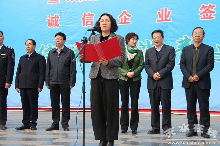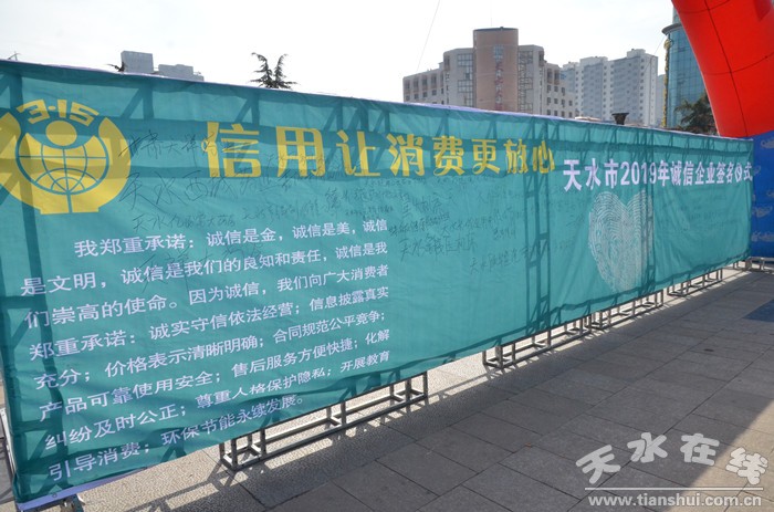 活動儀式上,市市場監(jiān)管局黨組書記、局長王宏瑋介紹了2019年天水市“3·15”消費維權(quán)年主題內(nèi)涵及系列活動安排;黨組成員、副局長聶惠仁宣布“雙隨機、一公開”抽查結(jié)果;秦州區(qū)市場監(jiān)管局主要負責人進行了表態(tài)發(fā)言;天水移動公司負責人代表誠信企業(yè)宣讀了“3.15誠信宣言”;誠信企業(yè)進行了誠信承諾簽名活動。