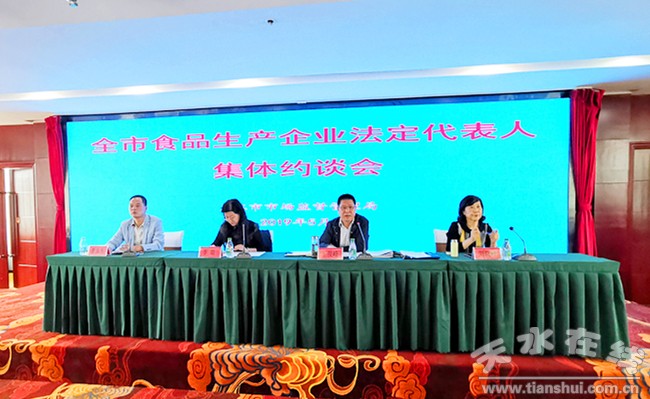 5月29日,天水市市場監(jiān)督管理局組織召開全市獲證食品生產(chǎn)企業(yè)法定代表人集體約談會(huì)議。市市場監(jiān)管局副局長王俊峰、副調(diào)研員李箭、市市場監(jiān)管綜合行政執(zhí)法隊(duì)副隊(duì)長劉曉峰及各縣區(qū)局分管領(lǐng)導(dǎo)、監(jiān)管人員和全市食品生產(chǎn)企業(yè)法定代表人約260余人參加了會(huì)議。