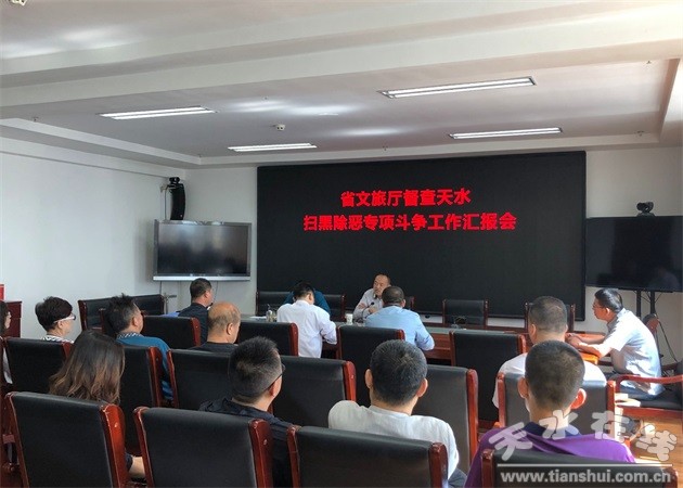 天水市文旅局黨組副書記魏國柱就天水市認真落實中央、省廳和市委市政府相關文件會議精神,全力開展專項斗爭工作情況向檢查組做了專題匯報。檢查組充分肯定了天水市文旅系統(tǒng)在掃黑除惡專項斗爭宣傳發(fā)動、專項整治、行業(yè)監(jiān)管等方面所做的工作,并就進一步提高政治站位,加強線索摸排,加大執(zhí)法檢查力度,營造良好宣傳輿論氛圍和存在的問題提出指導性意見和具體要求。市文化和旅游局表示,將嚴格按照檢查組提出的要求,進一步深入推進文旅系統(tǒng)掃黑除惡專項斗爭工作,加強宣傳輿論引導,提升掃黑除惡專項斗爭人人參與的社會氛圍;深挖涉黑涉惡線索,加強文化旅游市場亂象整治;加強與相關職能部門的配合,進一步理順文化旅游市場聯(lián)合執(zhí)法行動統(tǒng)籌協(xié)調機制;加大文化旅游市場監(jiān)管力度,確保全市文化旅游市場安全穩(wěn)定。