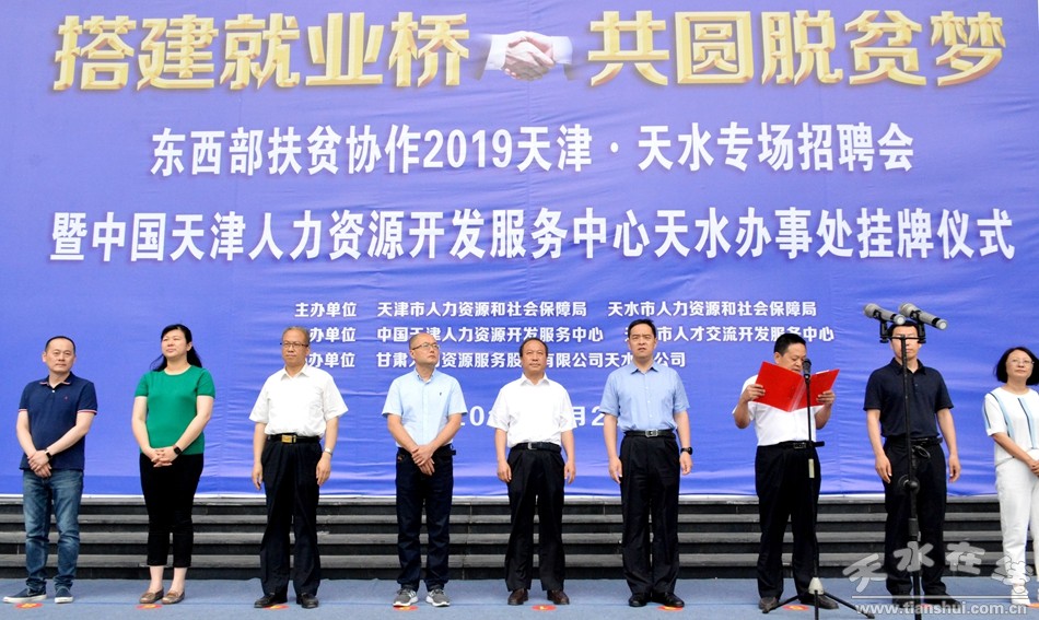 天水人社網(wǎng)訊 6月26日,天水市人力資源市場舉行東西部扶貧協(xié)作2019天津·天水專場招聘會暨中國天津人力資源開發(fā)服務(wù)中心天水辦事處掛牌儀式,共有269人簽訂就業(yè)協(xié)議。