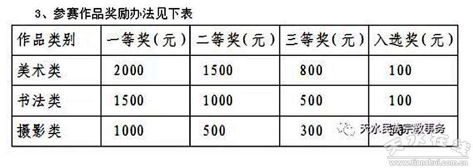 2、獎項設(shè)置:本次大獎賽按照書法、美術(shù)、攝影各設(shè)一等獎2名、二等獎5名、三等獎10名、入選獎若干名,并頒發(fā)獎金和證書。