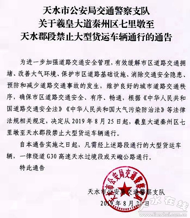 為進一步加強道路交通安全管理,有效緩解市區(qū)道路交通擁堵、改善大氣環(huán)境、保護市區(qū)道路基礎(chǔ)設(shè)施、消除交通安全隱患、預防和減少道路交通事故的發(fā)生,維護良好的城市道路交通秩序,確保市區(qū)道路交通安全、有序、暢通,根據(jù)《中華人民共和國道路交通安全法》《中華人民共和國大氣污染防治法》等法律法規(guī)相關(guān)規(guī)定,決定從2019年8月25日起,羲皇大道秦州區(qū)七里墩至天水郡段禁止大型貨運車輛通行。