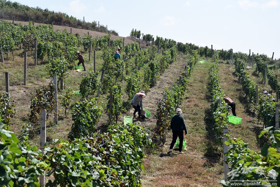 9月25日早晨,在天水市麥積區(qū)馬跑泉鎮(zhèn)孟家山村的甘肅莫恩葡萄酒業(yè)有限公司葡萄基地的地埂上,望著眼前一望無際的葡萄地上一串串像珍珠似瑪瑙的黑比諾葡萄和田地里人們正在采摘的豐收景象,作為釀酒商的楊永平心里樂開了花,今年他們種的200多畝黑比諾葡萄迎來了大豐收。