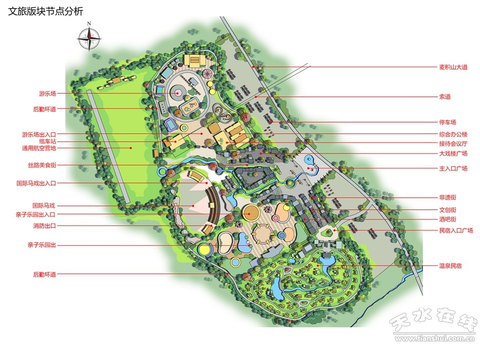 項(xiàng)目地塊二位于麥積山游客中心西側(cè)的山地上,項(xiàng)目建設(shè)內(nèi)容有國(guó)際游樂(lè)場(chǎng)、絲路美食街區(qū)、旅游演繹、無(wú)動(dòng)力親子樂(lè)園、山地式溫泉民宿及低空旅游營(yíng)地等新興旅游業(yè)態(tài)。以雅俗共賞,寓教于樂(lè),老少皆宜的表現(xiàn)形式,打造成一個(gè)功能齊全、相互映襯的、有著持久吸引力的一站式休閑旅游片區(qū)。