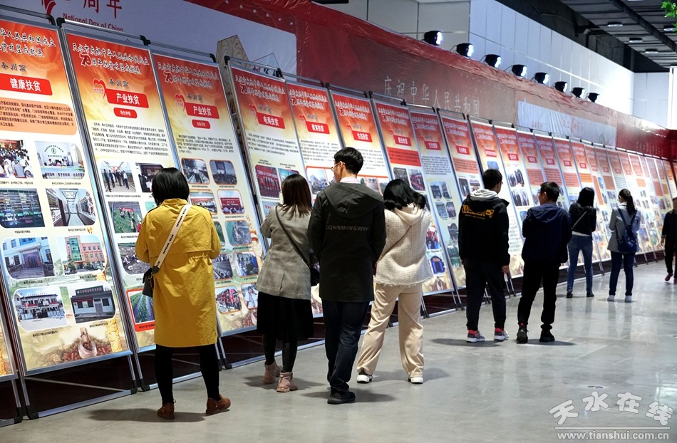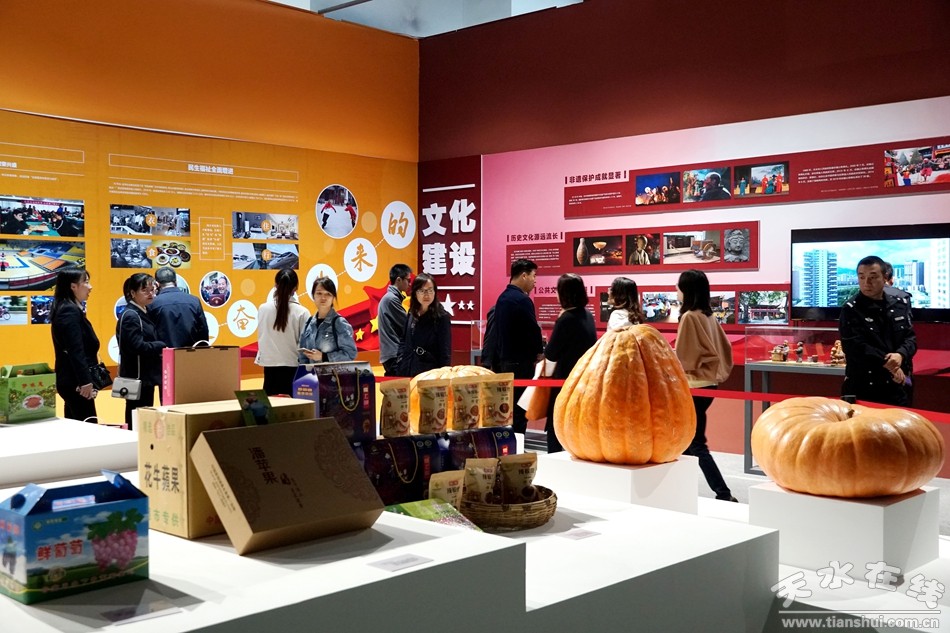 本次展覽分設(shè)天水市70周年“發(fā)展成就展”和“脫貧攻堅(jiān)成就展”兩個(gè)展區(qū),展陳面積4000多平方米。采用以門類為主的布展方式并結(jié)合傳統(tǒng)圖文展板、多媒體視頻、實(shí)物展臺(tái)、聲光電融媒體、線上VR體驗(yàn)、現(xiàn)場(chǎng)互動(dòng)等多種形式進(jìn)行布展。其中“經(jīng)濟(jì)社會(huì)發(fā)展成就展”展區(qū)以“壯麗七十年,奮斗新時(shí)代”為主題,共設(shè)置序言篇、歷程篇、專題篇、展望篇和尾聲五大展廳,用大量豐富詳實(shí)的資料、1000多張圖片和視頻,全方位展現(xiàn)新中國(guó)成立以來,特別是黨的十八大以來全市經(jīng)濟(jì)社會(huì)發(fā)生的深刻變化和取得的顯著成就!懊撠毠(jiān)成就展”展區(qū)設(shè)置170多幅展板,分前言、領(lǐng)導(dǎo)關(guān)懷、五個(gè)一批、政策落實(shí)、協(xié)作幫扶、能力提升、黨建引領(lǐng)、展望未來以及縣區(qū)篇等9個(gè)板塊,圖文并茂地展示了近30多年來天水人民不甘貧窮、艱苦奮斗、銳意進(jìn)取、蓬勃向上的精神風(fēng)貌;同時(shí)展陳了五縣兩區(qū)四大類型120余種扶貧產(chǎn)業(yè)的產(chǎn)品,全面展示了十八大以來脫貧攻堅(jiān)取得的階段性成就。