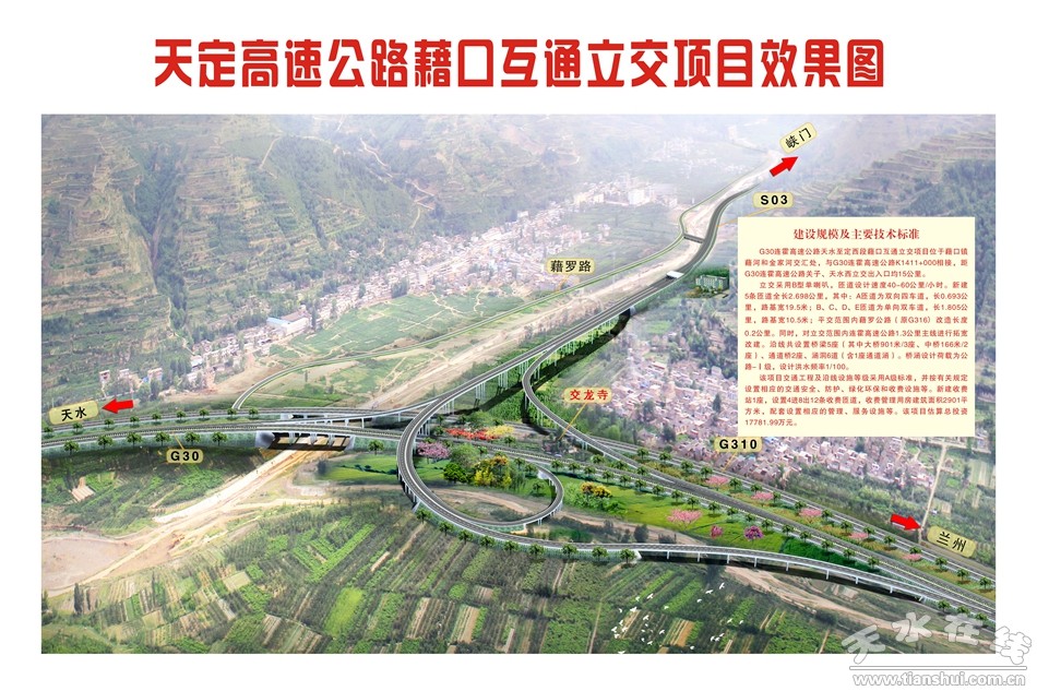 G30連霍高速公路天水至定西段藉口互通立交工程項(xiàng)目位于天水市秦州區(qū)藉口鎮(zhèn)藉河和金家河交匯處,與天定高速公路K1411+000相接,距G30連霍高速公路關(guān)子、天水西立交出入口均15公里。立交采用B型單喇叭。新建5條匝道全長2.698公里,平交范圍內(nèi)藉羅公路(原G316)改造長度0.2公里。同時(shí),對立交范圍內(nèi)連霍高速公路1.3公里主線進(jìn)行拓寬改建。沿線共設(shè)置橋梁5座(其中大橋901米/3座、中橋166米/2座)、通道橋2座、涵洞6道(含1座通道涵)。橋涵設(shè)計(jì)荷載為公路-Ⅰ級,設(shè)計(jì)洪水頻率1/100。該項(xiàng)目交通工程及沿線設(shè)施等級采用A級標(biāo)準(zhǔn),并按有關(guān)規(guī)定設(shè)置相應(yīng)的交通安全、防護(hù)、綠化環(huán)保和收費(fèi)設(shè)施等。新建收費(fèi)站1座,設(shè)置4進(jìn)8出12條收費(fèi)車道,收費(fèi)管理用房建筑面積2901平方米,配套設(shè)置相應(yīng)的管理、服務(wù)設(shè)施等。該項(xiàng)目總投資17781.99萬元。