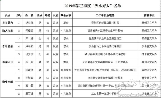 “天水好人”的評選由市文明辦牽頭,每季度評選一次。2019年第三季度,各縣區(qū)及市直各單位按照《關(guān)于組織開展“天水好人”推薦評選活動的通知》(市文明辦發(fā)〔2017〕5號)文件要求,共推薦上報“見義勇為”“助人為樂”“孝老愛親”“誠實守信”“敬業(yè)奉獻”五個類別“天水好人”候選人19名。