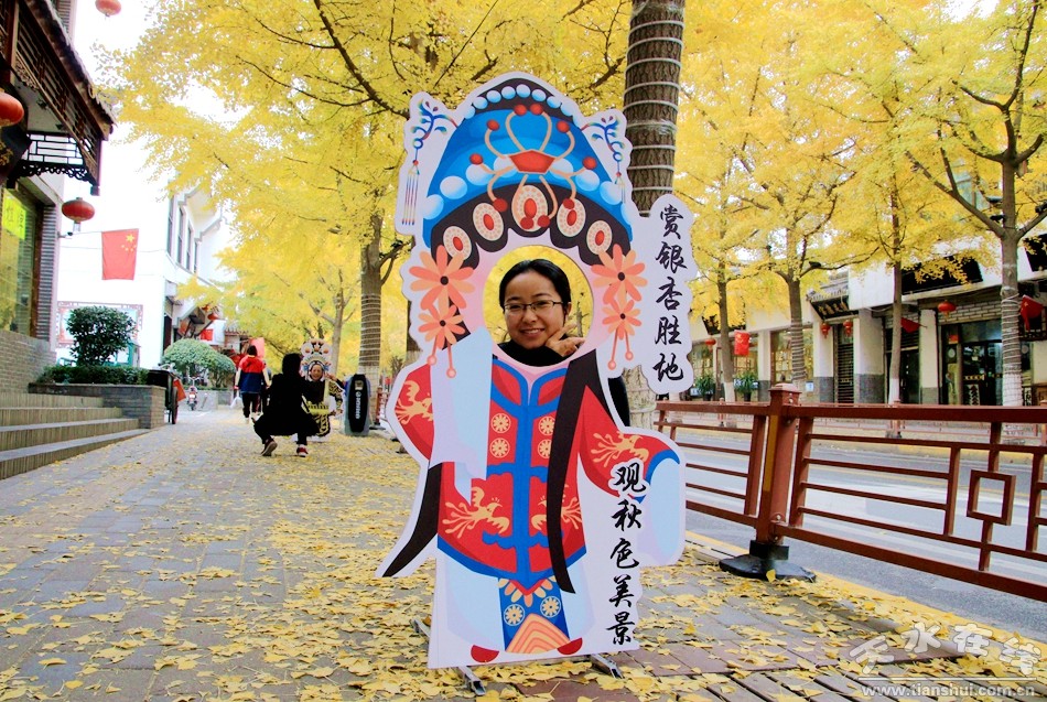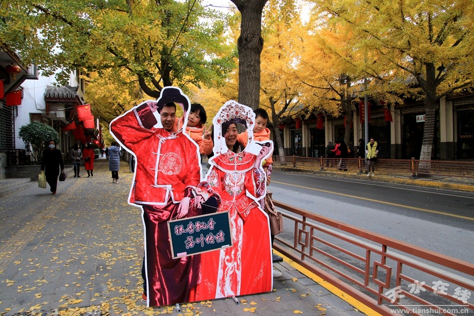 11月8日上午,被稱為“黃金大道”的天水市秦州區(qū)青年北路上,游客在道具前拍照留影。隨著滿樹金黃,落葉滿地,青年北路的“落葉不掃”景觀已經(jīng)進(jìn)入最佳觀賞期。