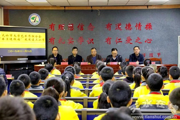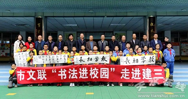 11月9日上午,天水市文聯(lián)“書法進(jìn)校園”活動(dòng)在天水市建三小學(xué)隆重舉行。此次活動(dòng)由市文聯(lián)黨組書記、主席、省書法家協(xié)會(huì)副主席楊清汀帶隊(duì),市書法家協(xié)會(huì)主席周宇春,天水市書畫院院長(zhǎng)、市書法家協(xié)會(huì)副主席李靖,秦州區(qū)文聯(lián)主席左昊蘇,市書法家協(xié)會(huì)副主席陳安祥,市書法家協(xié)會(huì)顧問謝榮生以及書法家王永斌、閆五權(quán)、趙志強(qiáng)、楊新國(guó)、張杰等參加活動(dòng)。