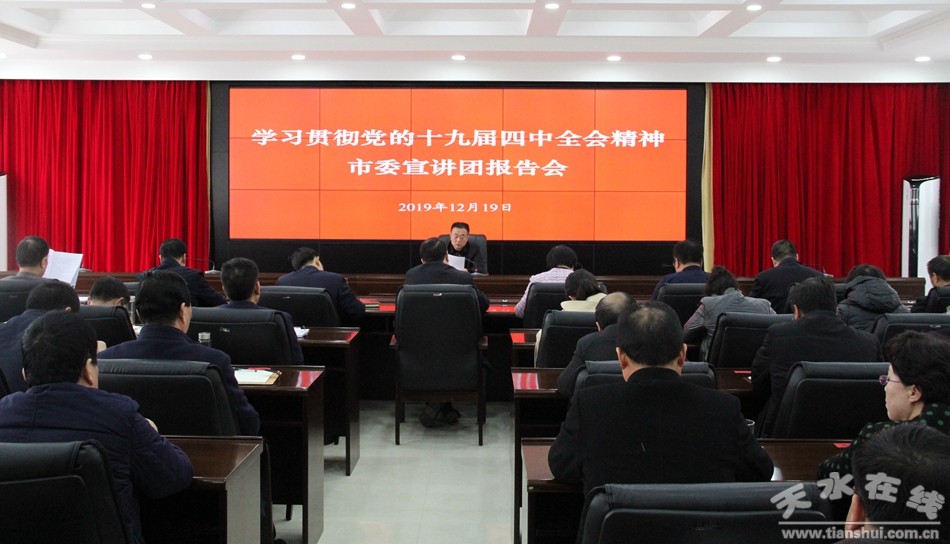 12月19日,根據(jù)市委統(tǒng)一部署,天水市人大常委會機(jī)關(guān)舉行學(xué)習(xí)宣傳貫徹黨的十九屆四中全會精神市委宣講報告會。市委宣講團(tuán)成員、市人大常委會黨組書記、主任蔣曉強(qiáng)作宣講報告。市人大常委會副主任安志宏、宋建平、王曉琴,秘書長楊坤以及機(jī)關(guān)黨員和干部職工、部分市人大代表參加報告會。