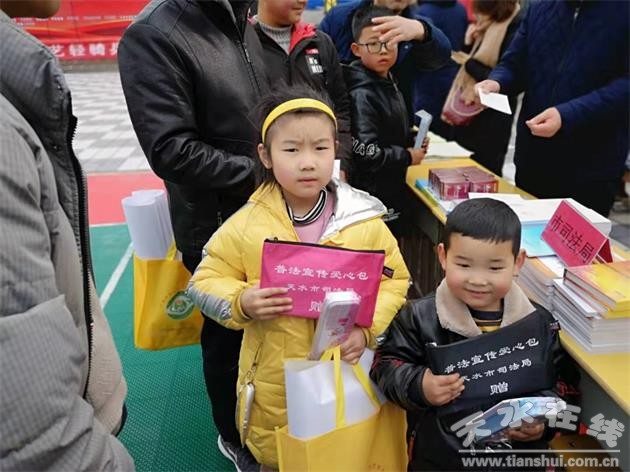 活動(dòng)現(xiàn)場(chǎng),天水市司法局充分發(fā)揮職能優(yōu)勢(shì),把開(kāi)展“法律進(jìn)鄉(xiāng)村”活動(dòng)作為貫徹落實(shí)黨的十九屆四中全會(huì)精神、推動(dòng)實(shí)施鄉(xiāng)村振興戰(zhàn)略全面實(shí)施、加快推進(jìn)農(nóng)業(yè)農(nóng)村現(xiàn)代化,采取群眾喜聞樂(lè)見(jiàn)、易于接受的形式,組織開(kāi)展了憲法、法律進(jìn)鄉(xiāng)村、掃黑除惡、法律服務(wù)咨詢(xún)等活動(dòng)!八头ㄏ锣l(xiāng)”小分隊(duì)通過(guò)設(shè)立咨詢(xún)臺(tái)、擺放宣傳版面、發(fā)放宣傳資料、“普法宣傳愛(ài)心包”(鉛筆盒、中性筆、法律援助及農(nóng)村法律問(wèn)答折頁(yè))、接待群眾咨詢(xún)的方式,重點(diǎn)宣傳了憲法、勞動(dòng)法、土地承包法、婚姻法、人民調(diào)解法、社區(qū)矯正法等與農(nóng)村廣大干部群眾密切相關(guān)的法律法規(guī);顒(dòng)現(xiàn)場(chǎng),發(fā)放憲法宣傳讀本500本、人民調(diào)解法宣傳書(shū)籍100本、農(nóng)村法律書(shū)籍100余冊(cè),普法宣傳愛(ài)心包300個(gè),普法宣傳袋500個(gè)、法治撲克200幅、紙杯500個(gè),接待群眾現(xiàn)場(chǎng)咨詢(xún)200余人次。
