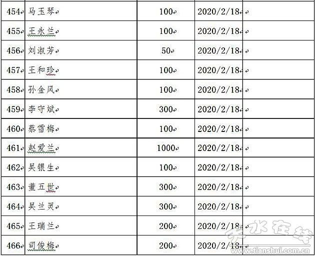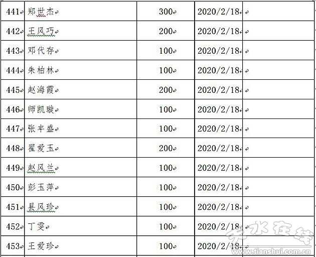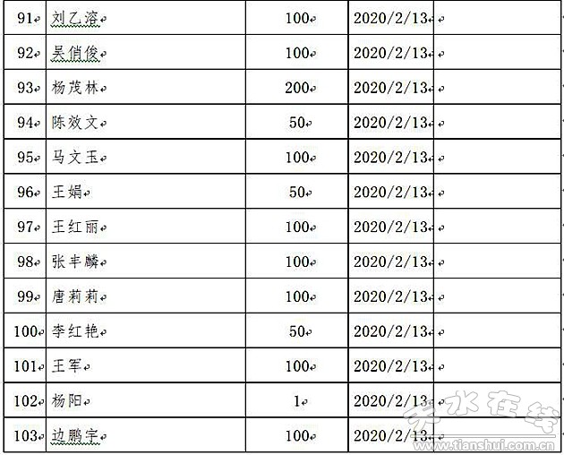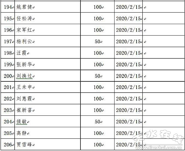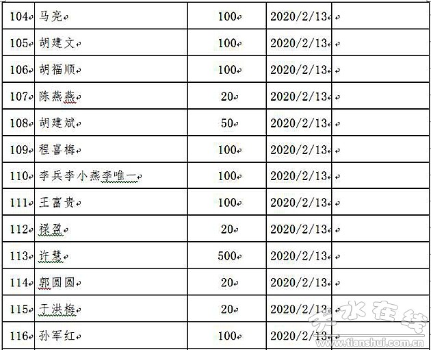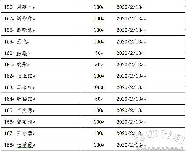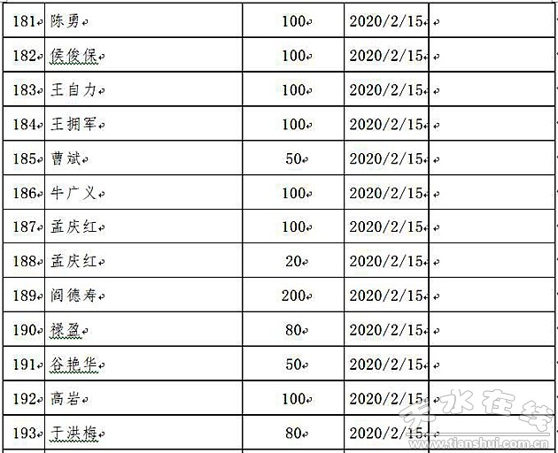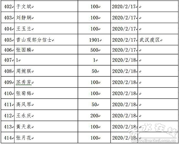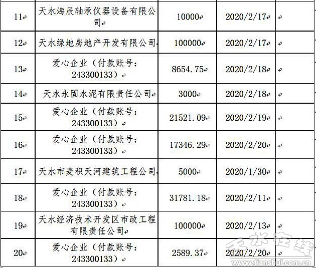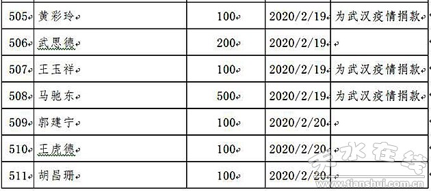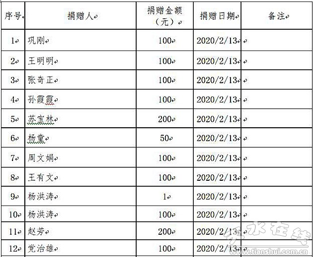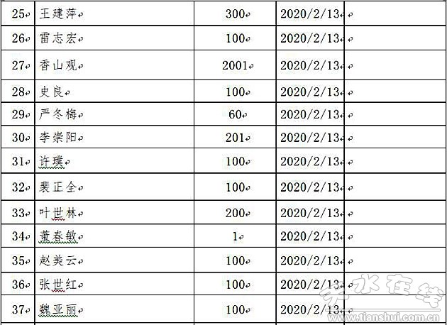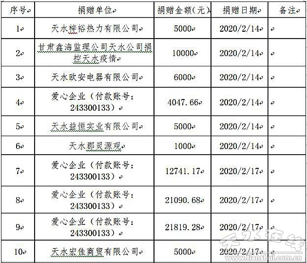 3.浙商銀行天水分行和浙商銀行天水分行員工捐款128800元為定向捐款,其中:407醫(yī)院6萬元、秦州區(qū)人民醫(yī)院6.88萬元;甘肅睿陽科技有限公司(范軍強(qiáng))捐款12000元定向用于天水市疾控中心;李彥林捐款2000元定向用于市中醫(yī)院兒科;香山觀部分信士捐款1901元定向用于武漢疫區(qū),撥付給武漢市慈善總會。